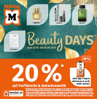 *In der Filiale wird der Rabatt an der Kassa abgezogen. Aktion ist nicht gültig auf andere Aktionspreise und nicht mit anderen Aktionen (z.B. Coupons, %-Aktionen, Naturalrabatte, etc.) und aktuellen Angeboten kombinierbar. Ausgenommen von der Aktion sind Gutscheinkauf, Make-up Services, Tragetaschen und kostenpflichtiges Verpackungsmaterial. Gültig vom 02.10. – 04.10.2025 in deiner Müller Filiale in der MILLENNIUM CITY . Nur solange der Vorrat reicht. Keine Barauszahlung.