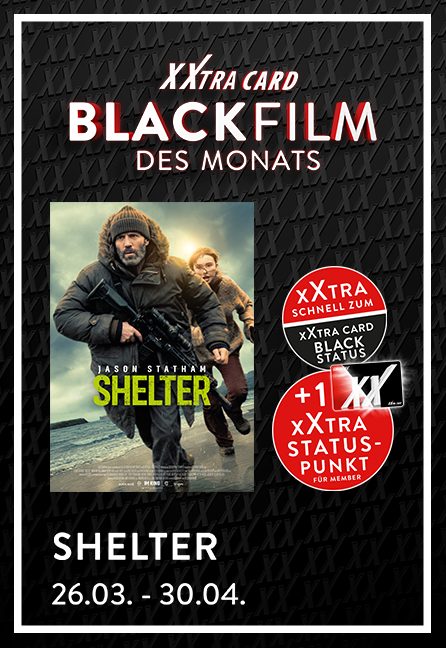 Das Special für alle Cineplexx xXtra Card Member, die möglichst schnell Statuspunkte sammeln möchten: ab 26.03.2026 findet unser BLACK Film des Monats mit „SHELTER“ statt.