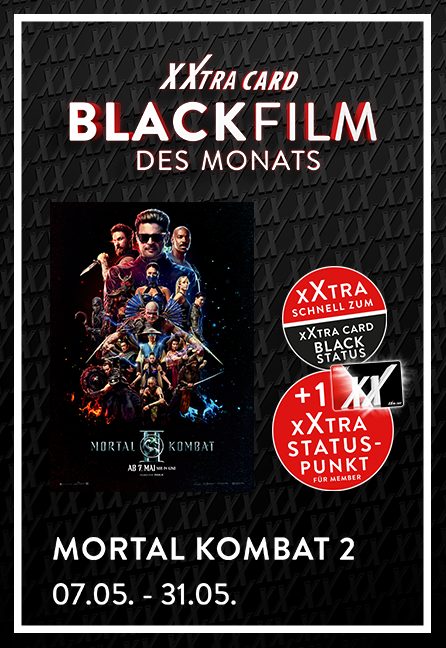 Das Special für alle Cineplexx xXtra Card Member, die möglichst schnell Statuspunkte sammeln möchten: ab 7.05.2026 findet unser BLACK Film des Monats mit „Mortal Kombat II“ statt.