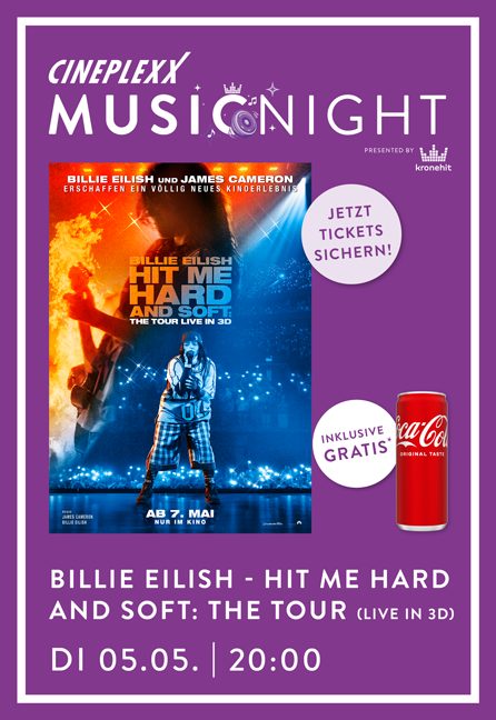 Gemeinsam mit Kronehit und Coke Music präsentiert Cineplexx deine Konzert Highlight auf der großen Leinwand. Am 5.5.2026 um 20:00 mit “Billie Eilish – Hit mir hard and soft: The Tour – (Live in 3D)“