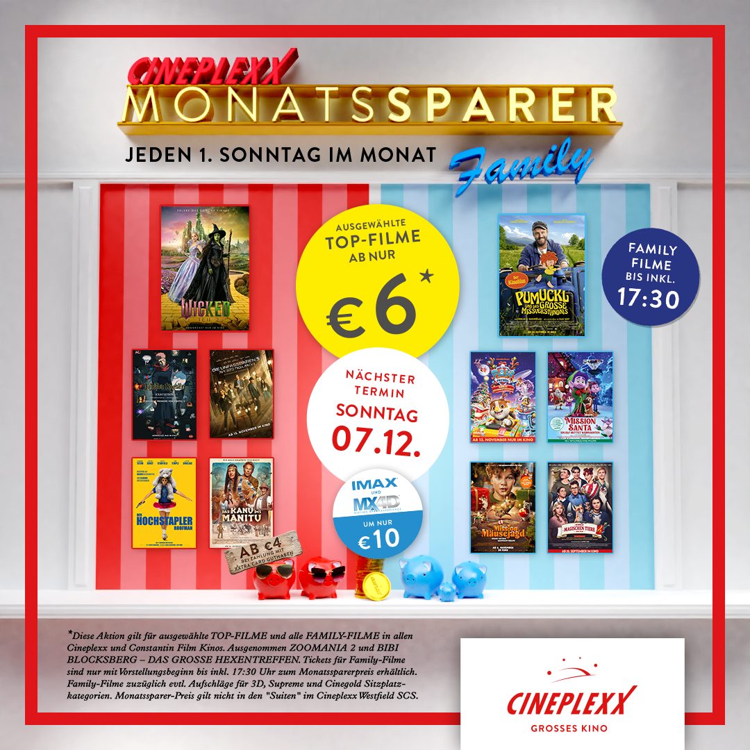 Family Filme zuzüglich evtl. Aufschläge für 3D, Supreme und Cinegold Sitzplatzkategorien. Der Monatssparer-Preis gilt nicht in den “Suiten” im Cineplexx Westfield SCS.