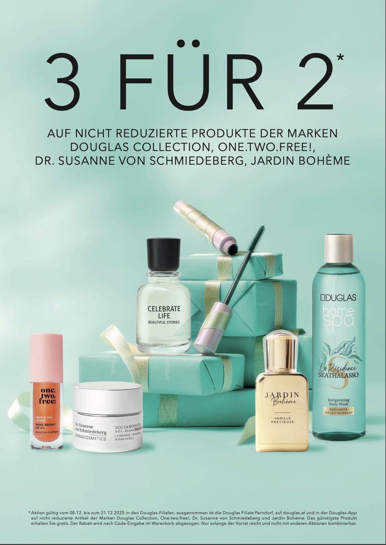 In der Vorweihnachtszeit gibt es jetzt bei Douglas in der MILLENNIUM City eine 3 für 2 Aktion auf nicht reduzierte Produkte der Marken Douglas Collection, One.Two.Free!, Dr. Susanne von Schmiedeberg und Jardin Bohème.