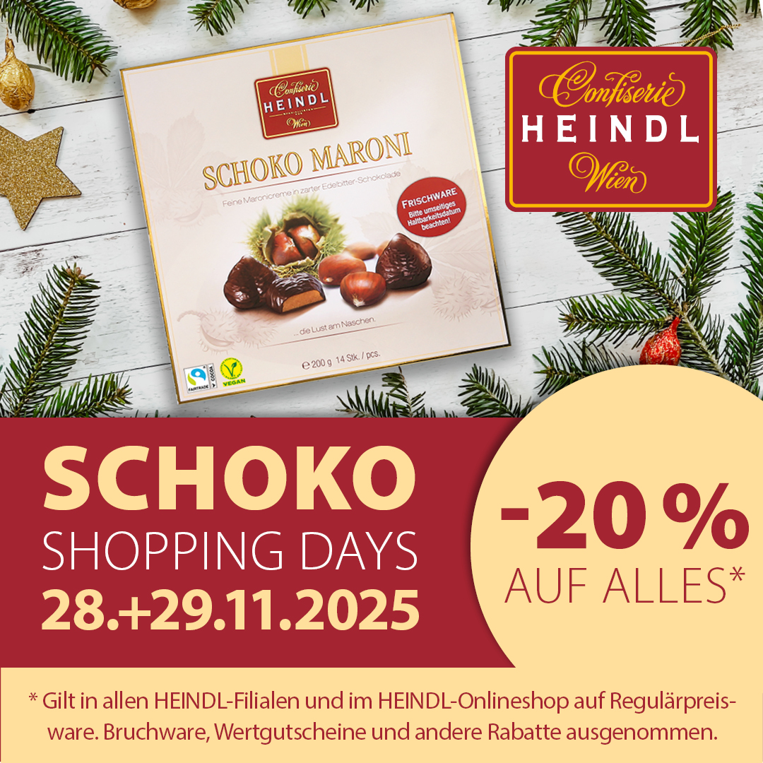Am Freitag, den 28. November 2025 ist SCHOKO SHOPPING DAY und deshalb gibt es in deiner Heindl-Filiale in der MILLENNIUM City -20% auf ALLES*!