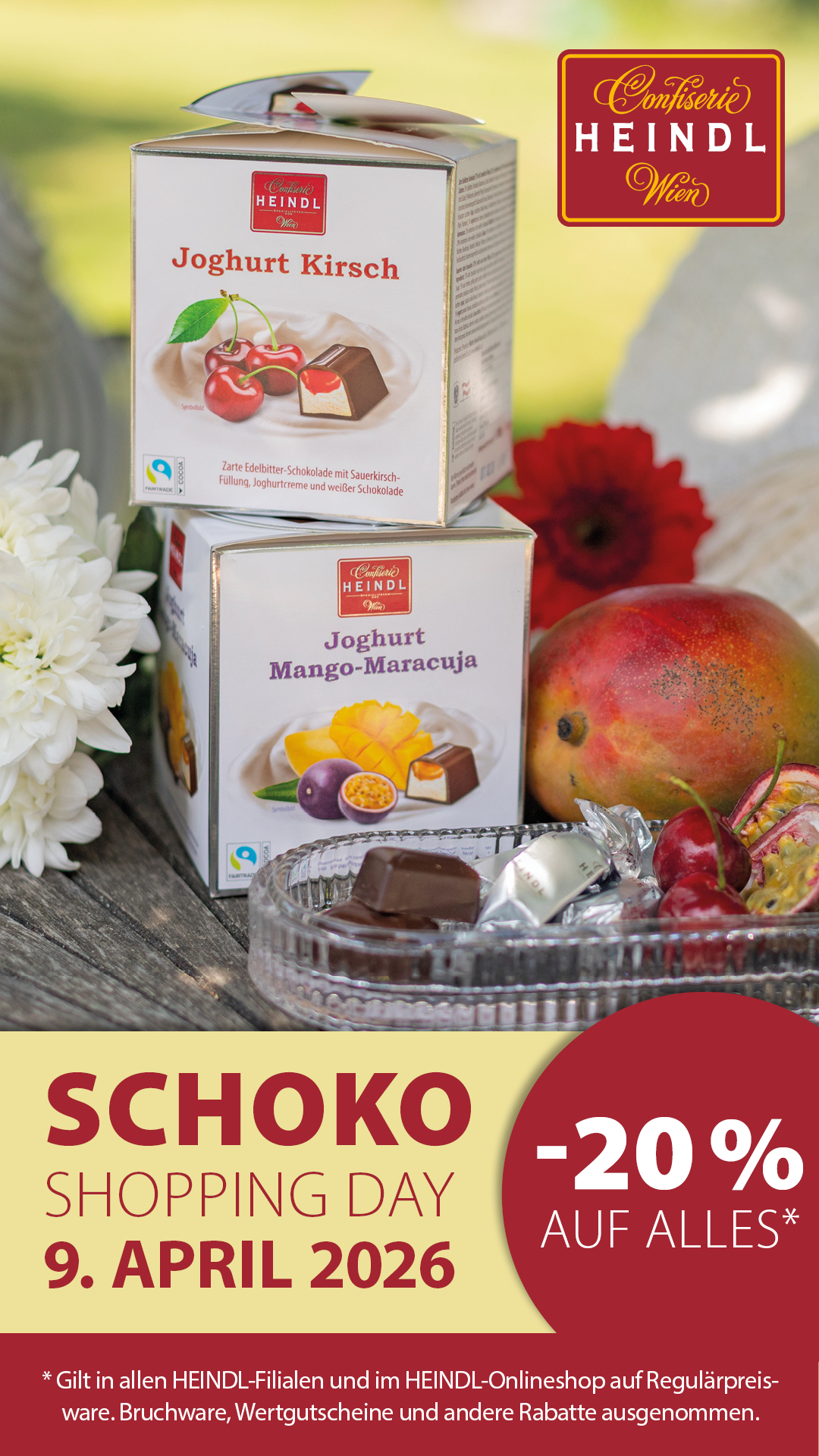 Am 9. April 2026 ist SCHOKO SHOPPING DAY und deshalb gibt es in der Heindl-Filiale in der MILLENNIUM City -20% auf ALLES*.