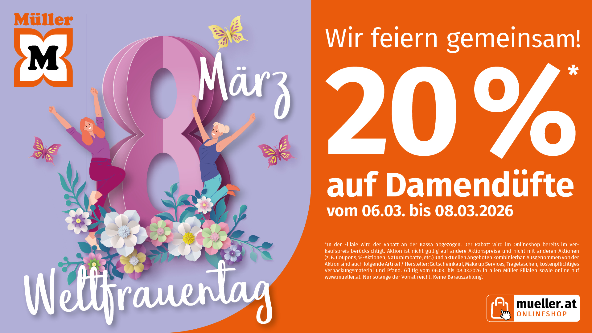 Freu dich daher auf 20% Rabatt auf Damendüfte vom 06.03.-08.03.2026 bei Müller. 🌸🦋