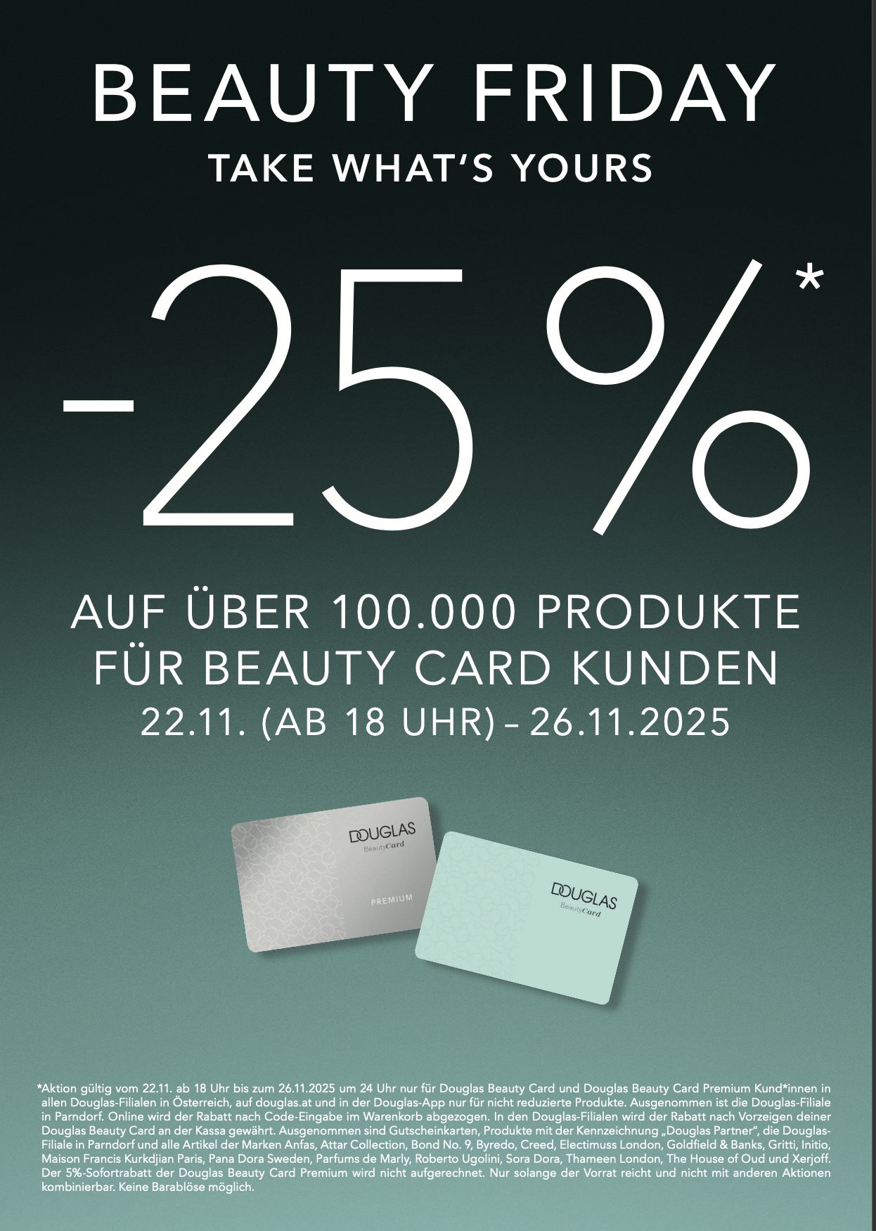 *Aktion gültig vom 22.11. ab 18 Uhr bis zum 26.11.2025 um 24 Uhr nur für Douglas Beauty Card und Douglas Beauty Card Premium Kund*innen in der Douglas Filiale in der MILLENNIUM City. Online wird der Rabatt nach Code-Eingabe im Warenkorb abgezogen. In den Douglas-Filialen wird der Rabatt nach Vorzeigen deiner Douglas Beauty Card an der Kassa gewährt. Ausgenommen sind Gutscheinkarten, Produkte mit der Kennzeichnung „Douglas Partner“ und alle Artikel der Marken Anfas, Attar Collection, Bond No. 9, Byredo, Creed, Electimuss London, Goldfield & Banks, Gritti, Initio, Maison Francis Kurkdjian Paris, Pana Dora Sweden, Parfums de Marly, Roberto Ugolini, Sora Dora, Thameen London, The House of Oud und Xerjoff. Der 5%-Sofortrabatt der Douglas Beauty Card Premium wird nicht aufgerechnet. Nur solange der Vorrat reicht und nicht mit anderen Aktionen kombinierbar. Keine Barablöse möglich.