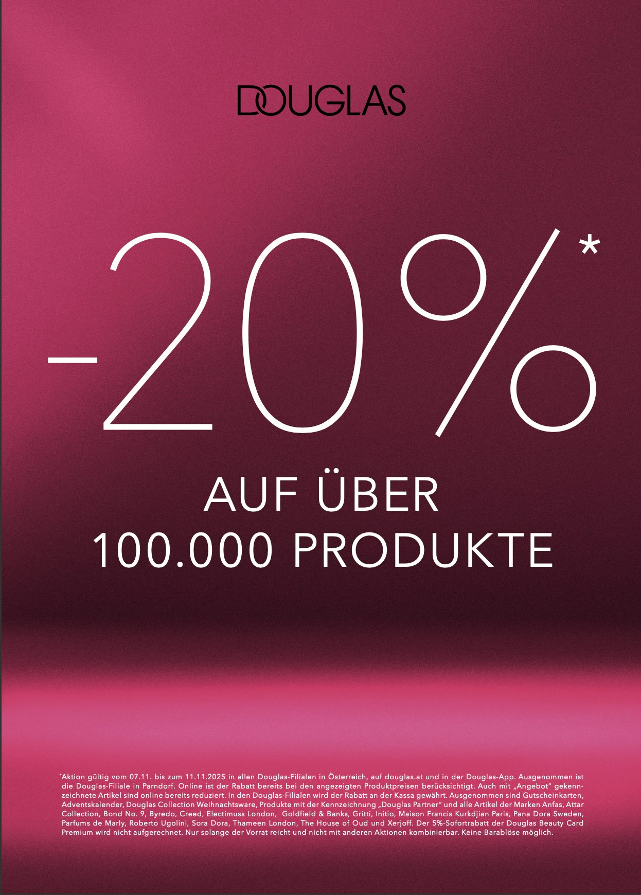 *Aktion gültig vom 07.11. bis zum 11.11.2025. In der Douglas-Filiale wird der Rabatt an der Kassa gewährt. Ausgenommen sind Gutscheinkarten, Adventskalender, Douglas Collection Weihnachtsware, Produkte mit der Kennzeichnung „Douglas Partner“ und alle Artikel der Marken Anfas, Attar Collection, Bond No. 9, Byredo, Creed, Electimuss London, Goldfield & Banks, Gritti, Initio, Maison Francis Kurkdjian Paris, Pana Dora Sweden, Parfums de Marly, Roberto Ugolini, Sora Dora, Thameen London, The House of Oud und Xerjoff. Der 5%-Sofortrabatt der Douglas Beauty Card Premium wird nicht aufgerechnet. Nur solange der Vorrat reicht und nicht mit anderen Aktionen kombinierbar. Keine Barablöse möglich.