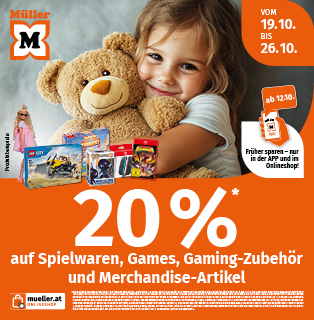 *Die Aktion gilt ausschließlich auf Artikel der Kategorien „Spielwaren, Games, Gaming-Zubehör und Merchandise Artikel“. Der Rabatt wird an der Kassa abgezogen. Die Aktion ist nicht gültig auf andere Aktionspreise und nicht mit anderen Aktionen (z.B. Coupons, %-Aktionen, Naturalrabatte, etc.) und aktuellen Angeboten kombinierbar. Ausgenommen von der Aktion sind auch folgende Artikel / Hersteller: Produkte i.S.d. Buchpreisbindungsgesetzes (z.B. Bücher), preisgebundene Verlagserzeugnisse (z.B. Zeitungen und Zeitschriften), Gutscheinkauf, Dienstleistungen, Network / Online Karten, Hörbücher und Hörspiele, Spielekonsolen / VR-Brillen von Nintendo / Sony / Microsoft, Smartphones / Handys, Tablets, Airpods / Earpods, TV-Geräte, PC / Laptop, Apple-Artikel, Amazon-Artikel, OOONO, Prepaid-Karten, Tragetaschen, kostenpflichtiges Verpackungsmaterial und Pfand. Nur solange der Vorrat reicht. Die Firma Müller behält sich vor, die Aktion jederzeit ohne Vorankündigung zu beenden. Keine Barauszahlung.