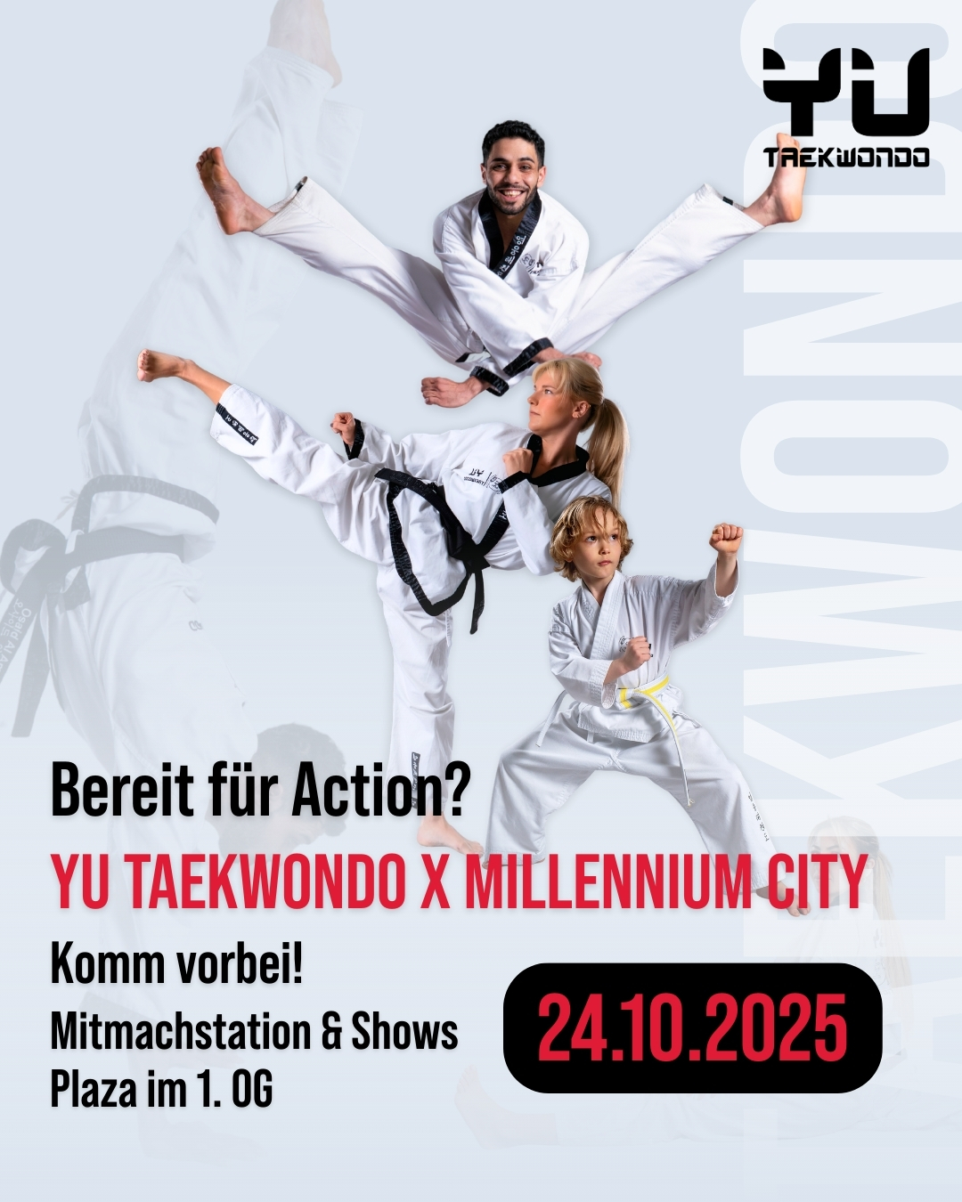 Du hast Freude an Bewegung? Du willst deine Grenzen austesten und deine Gesundheit dauerhaft stärken? Dann komm am 24. Oktober bei uns in der MILLENNIUM City vorbei und lerne die traditionelle Kampfkunst „Taekwondo“ kennen – mit YU-TAEKWONDO.